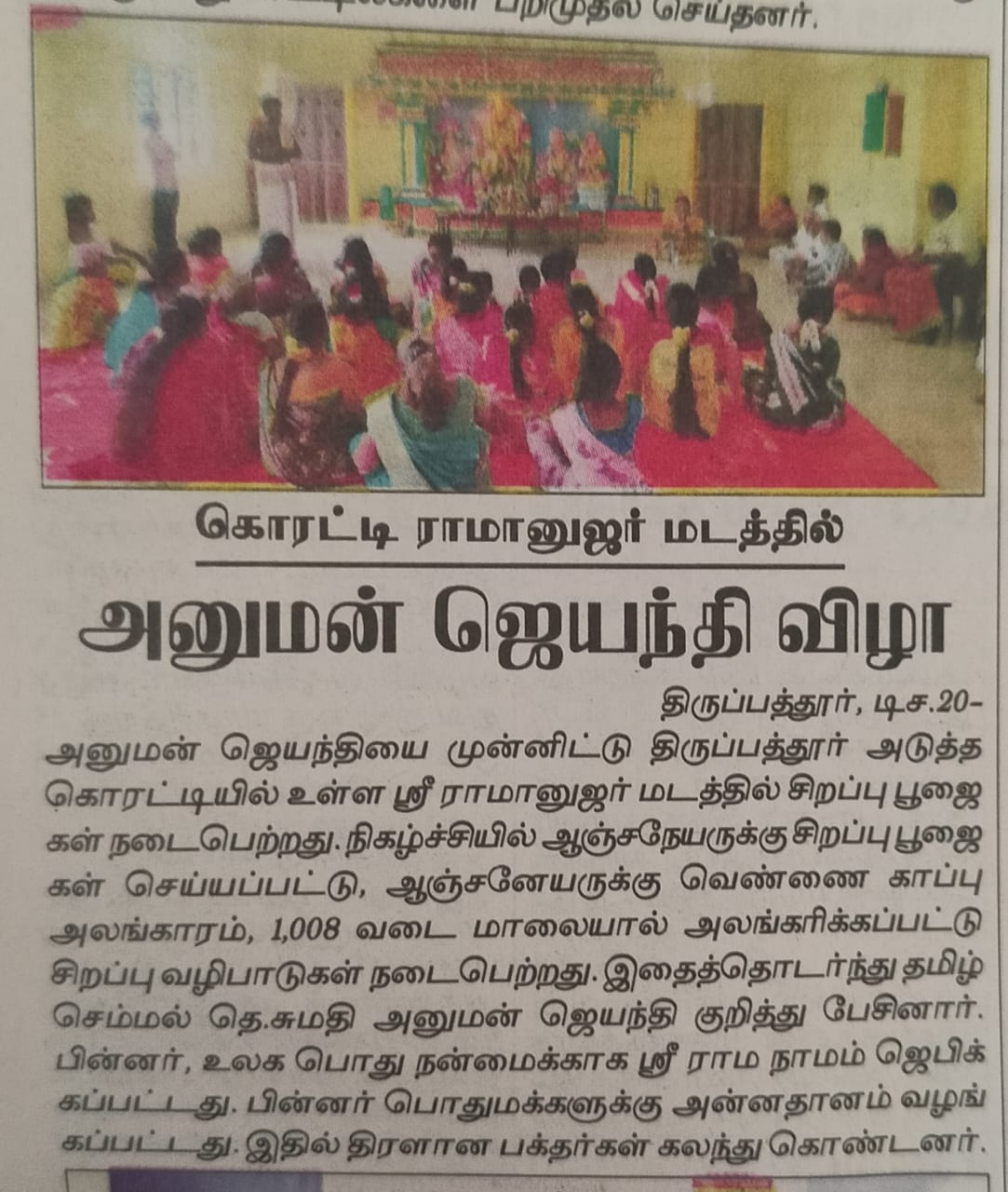 திருப்பத்தூர்-சேலம் சாலையில் திருப்பத்துர் அடுத்த 8-ஆவது கிலோமீட்டர் தொலைவில் ஸ்ரீ ராமானுஜர் மடம் தர்மசத்திரம் கட்டியுள்ளோம்.