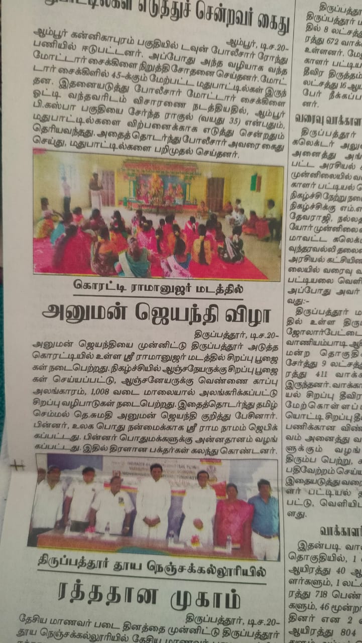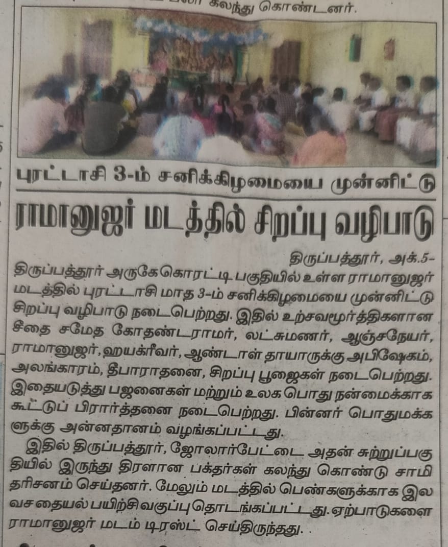 திருப்பத்தூர்-சேலம் சாலையில் திருப்பத்துர் அடுத்த 8-ஆவது கிலோமீட்டர் தொலைவில் ஸ்ரீ ராமானுஜர் மடம் தர்மசத்திரம் கட்டியுள்ளோம்.